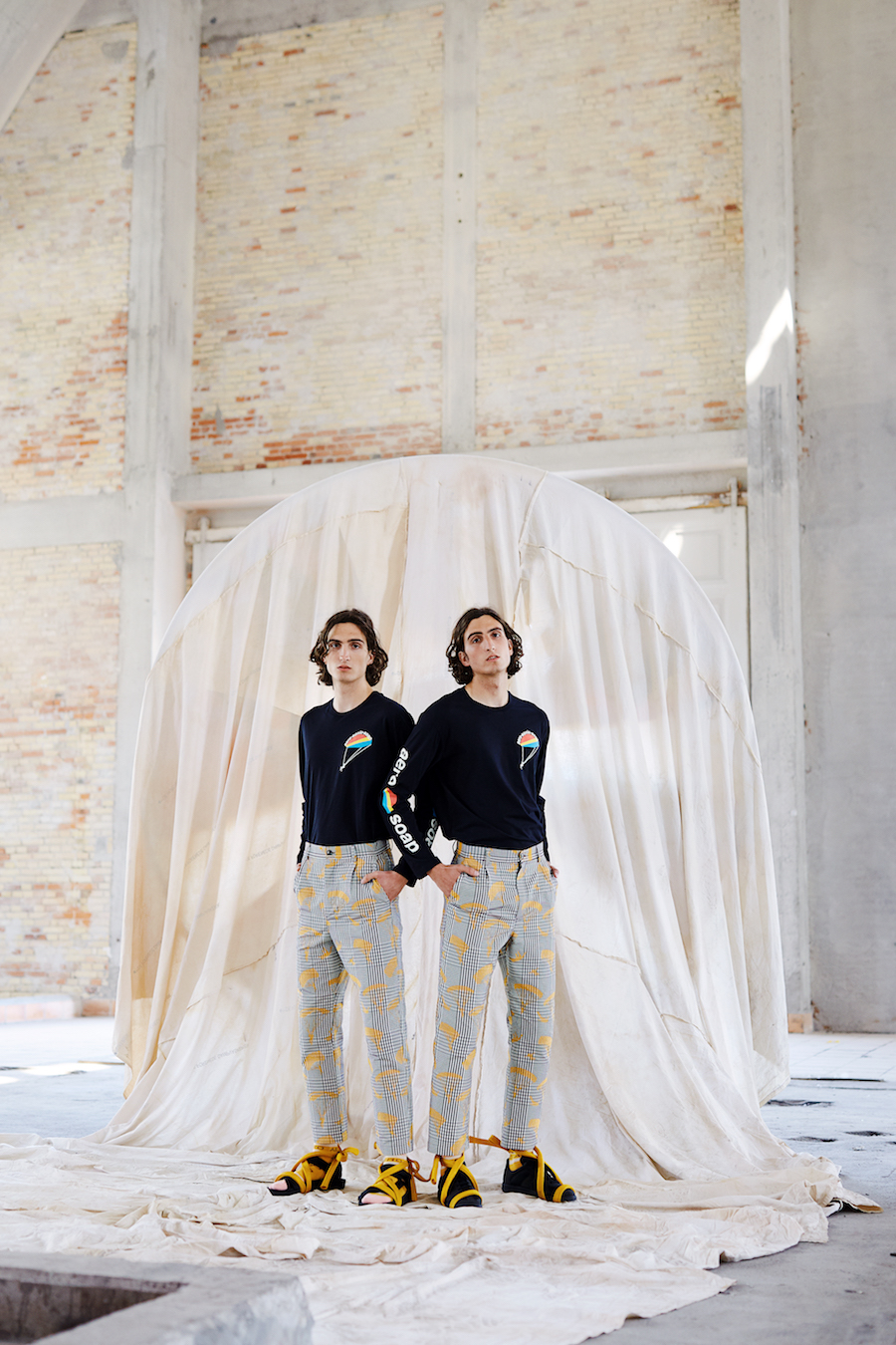 ほこりっぽいティーカラーの作業服を着たパフォーマーたち、 ヴィブス・エアーリペアサービス ( VIBS Air Repair Service ) は、機械の風車を手動でコントロールしています。 インスタレーションはランドリーサービスのリサイクルの古いシートを使用し、ブラックティーの色をしています。 リズム、音、体の動きと鼓を通して、インスタレーションはコレクションのインスピレーション源を強調します。 それは、いかに人が風に抵抗しないで、風とともに働くことができるかということを視覚化しているのです。
