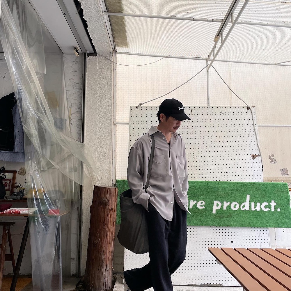 単調に合わせた後は絶妙な生地の重さ、ポケットのデザイン、前に振られた袖、ダルいバッグ。それらに任せれば完成するしCAP被れば締まってくれるとゆう。