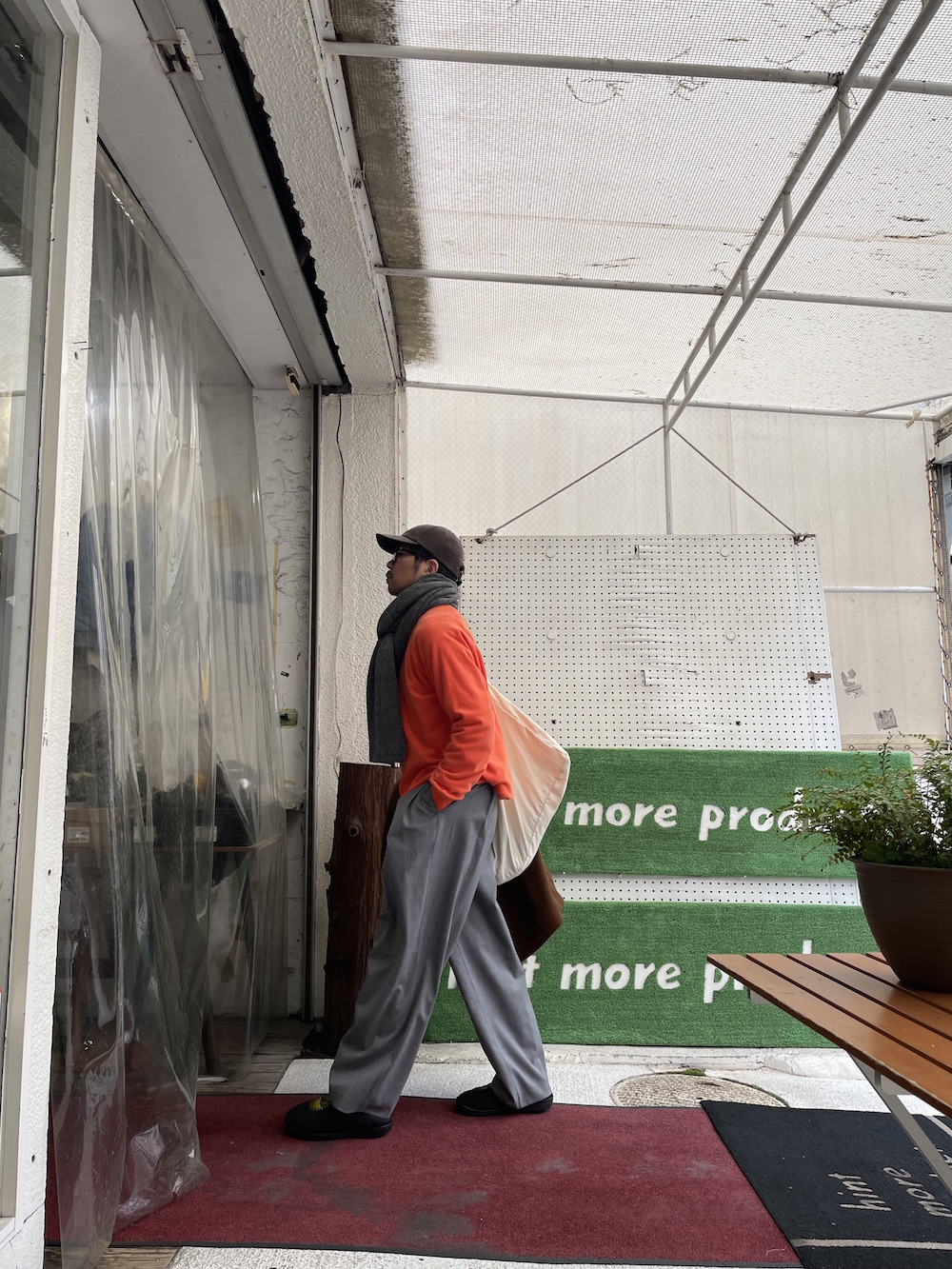 マイビュー新作のグレースラックス、クロークのオレンジ、そしてマイビューのスウェーデン軍のモーターサイクルコートをデザインベースにした茶色のコート。
